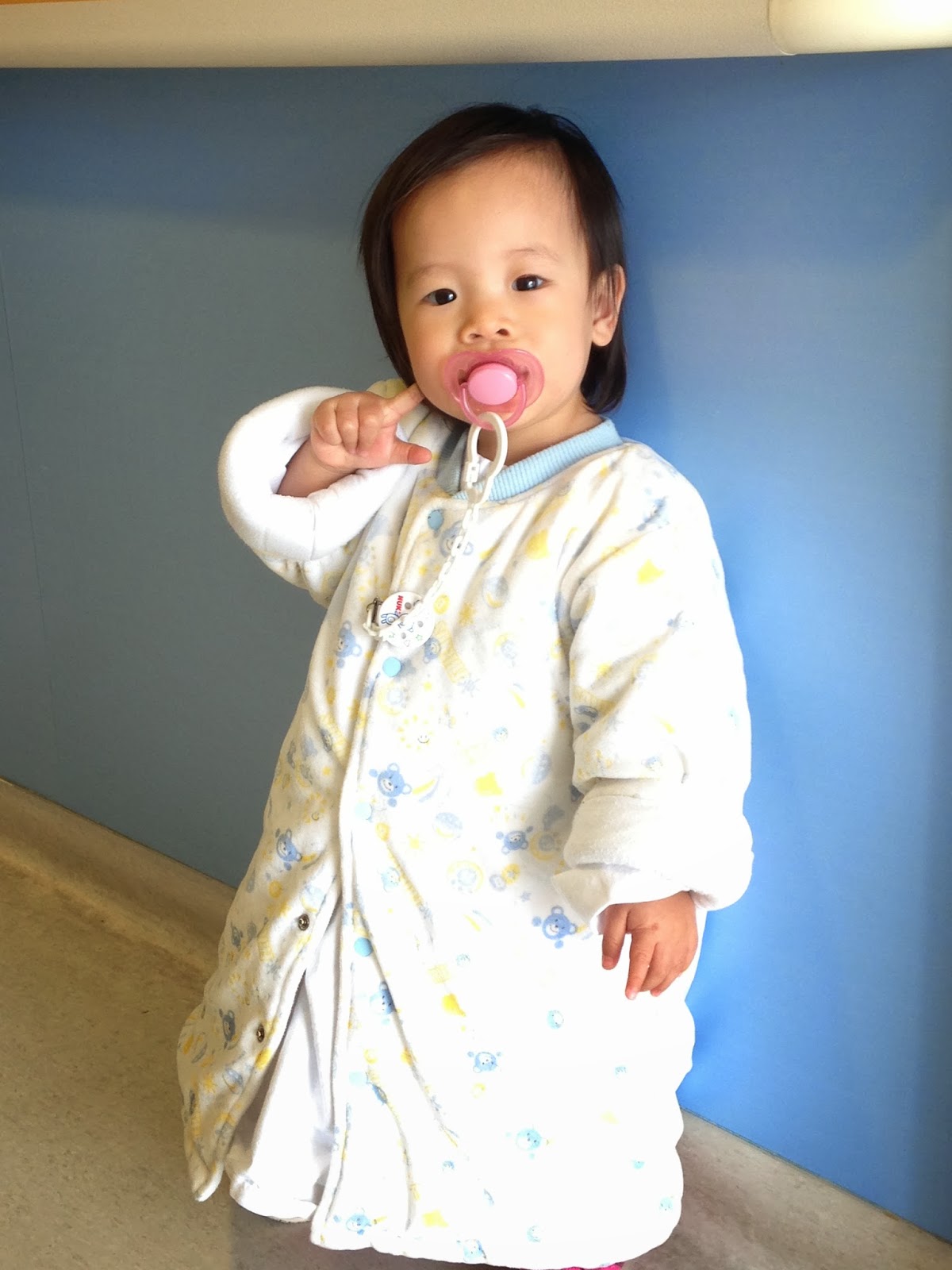 丁丁今日入院啦, 雖然醫生多次強調係小手術, 但始終丁丁第一次GA做手術, 做呀媽既我點會唔擔心; 因為我要返工, 朝早交比婆婆爸爸呀姨同丁丁入院; 我一放工搭的士去, 點知送手術室尾......想喊! 好在個手術超快, 係病房坐低20分鐘度, 姑娘就叫我地落去見醫生同接丁丁返房; 丁丁已醒, 係度喪喊, 可想而知GA都真係好輕藥下! 一聽到我把聲就冇事, 但係咁拑住我要我抱囉, 無問題, 寶貝女! 上到房佢都攰, 訓左大半個鐘, 一醒就活躍返晒; 仲好快咁即刻飲到水, 同食左3粒好似佢拳頭咁大既士多啤梨, 兩塊卷蛋, 十幾粒提子, 再食真係驚佢嘔; 到五點半, 佢有埋wee wee, 醫生又巡多次房, 我地都出院啦!